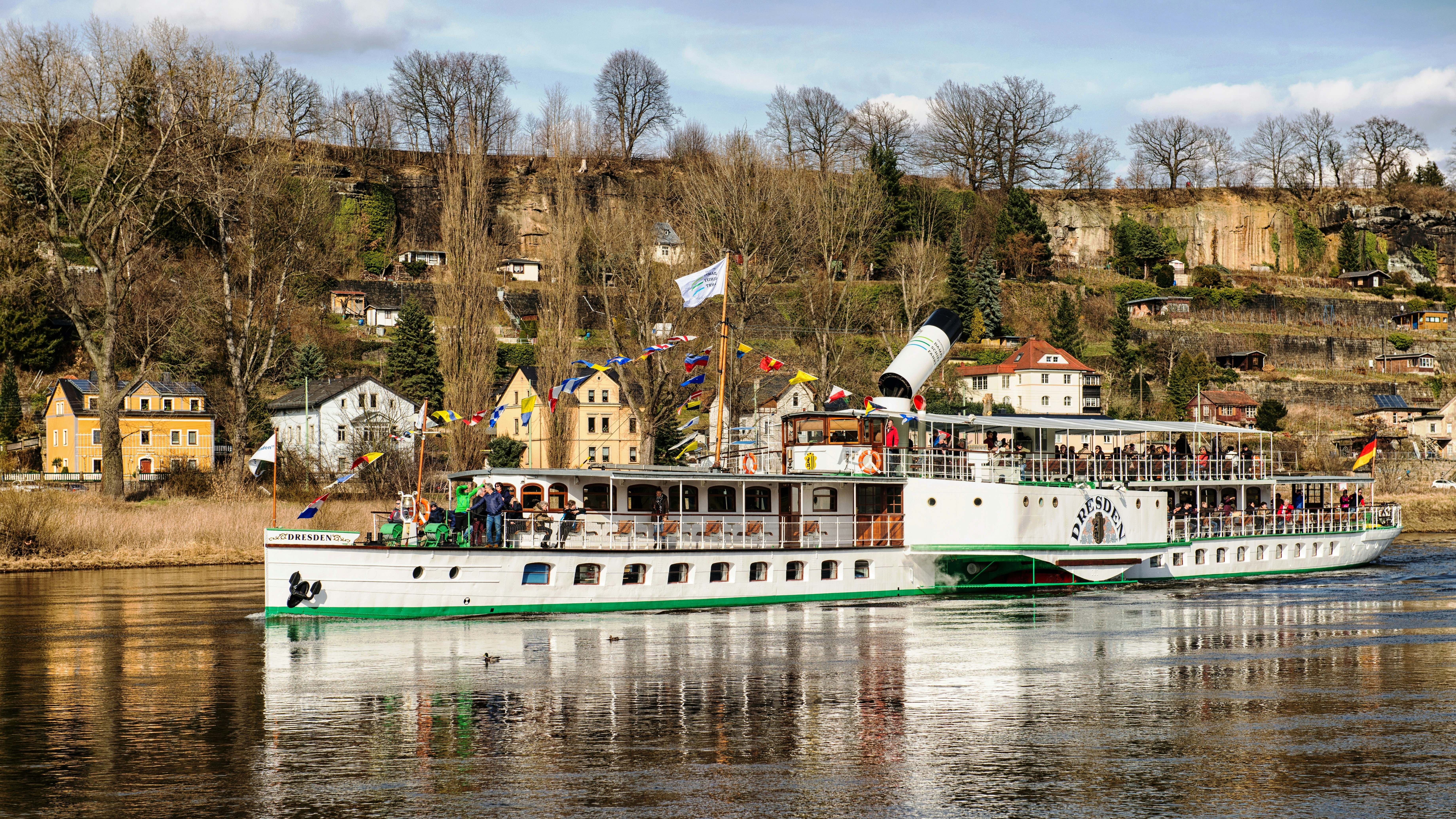 Danach 11:00 Uhr bis – ca. 12:30 Vom Terrassenufer Dresden aus heißt es: Alles an Bord! Mit neun historischen Raddampfern verfügt die Sächsische Dampfschifffahrt über die älteste und größte Raddampferflotte der Welt. Vorbei an den drei Elbschlössern fahren wir elbaufwärts zum »Blauen Wunder«. Vom Schiff aus bietet sich uns hautnah der